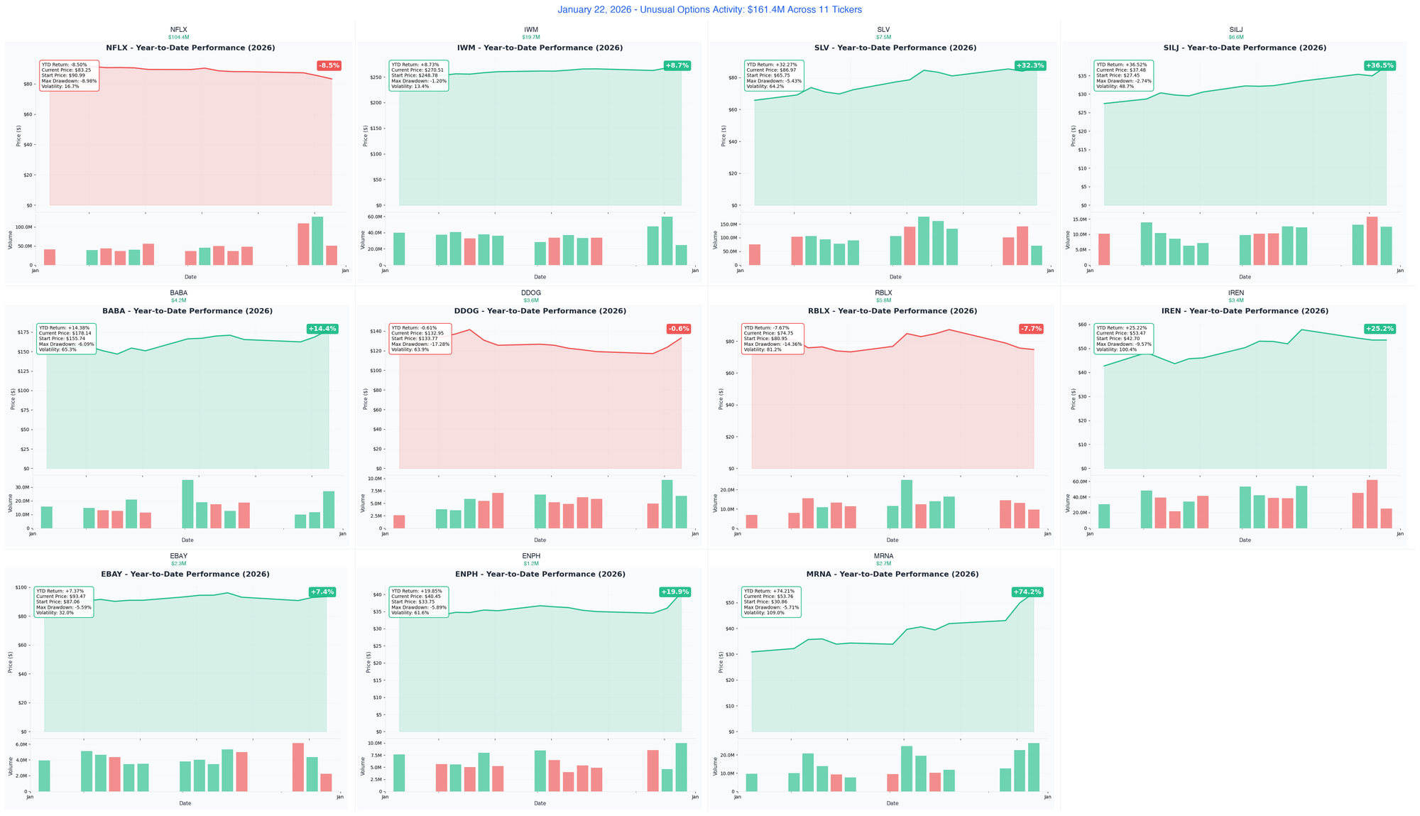 - SILJ Weekly Calls - The $6.6M bullish roll-up in junior silver miners is a momentum trade. If silver continues squeezing, these miners have 3-5x leverage to the metal. January 23 and January 30 expirations mean this is a knife-catch - either you catch the move or you don't.
