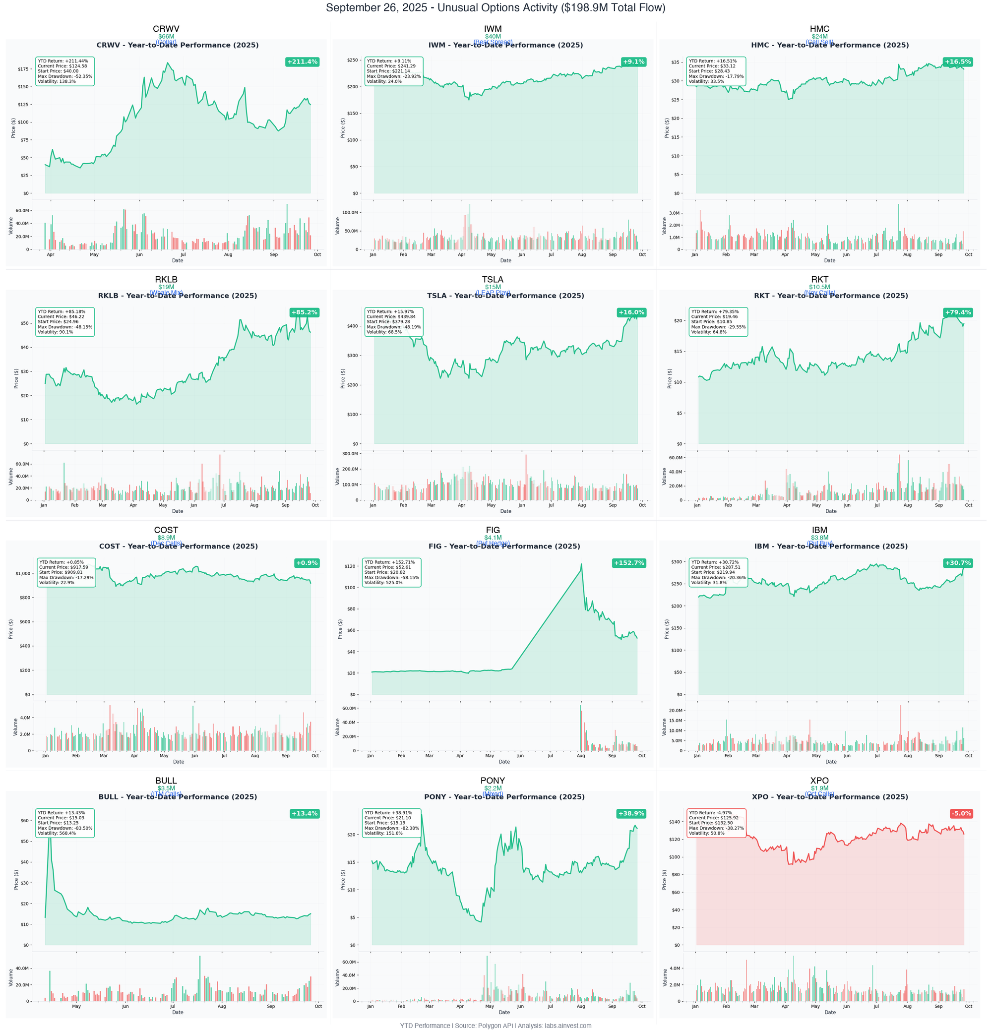 🔥 INSTITUTIONAL AVALANCHE: Today's tape exploded with $198.9 MILLION in whale-sized options trades across 12 tickers - featuring a massive $40M bearish bet against small-caps (IWM), AI infrastructure giant CoreWeave's $66M collar trade (CRWV), and Honda's mysterious $24M call dump (HMC). This isn't random trading - it's coordinated institutional repositioning ahead of Q3 earnings, Fed decisions, and sector rotations.