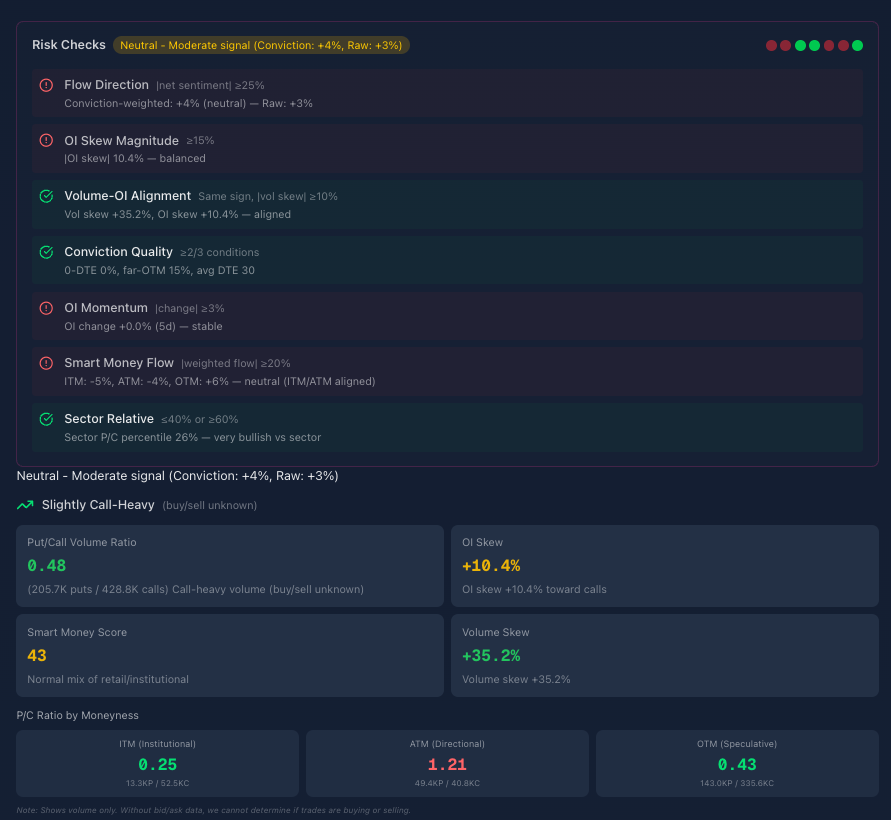 | Smart Money Flow | ITM/ATM alignment | ≥20% weighted | Neutral | ❌ Mixed |