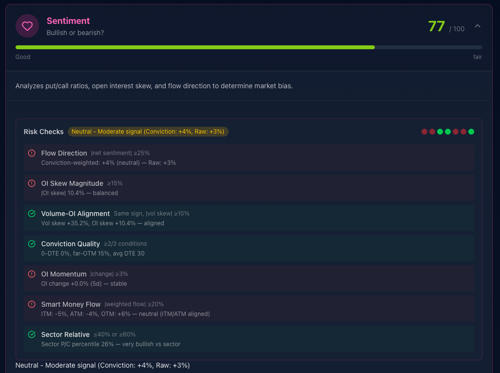 | Conviction Quality | Quality of the flow | ≥2/3 conditions | 0-DTE 0%, avg DTE 30 | ✅ Good |