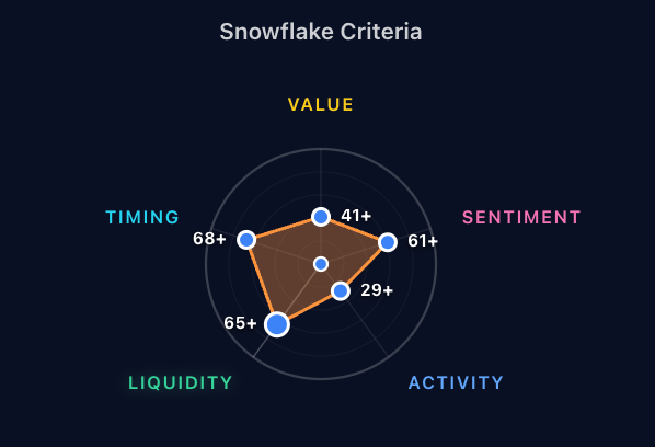 Each stock gets a full breakdown. NFLX shows: Value 50 (fairly priced), Sentiment 56 (slightly bullish), Activity 53 (normal trading), Liquidity 83 (easy to trade), Timing 64 (good entry window). The radar chart summarizes everything at a glance β in this case, conditions favor selling premium because liquidity is high and timing is decent.