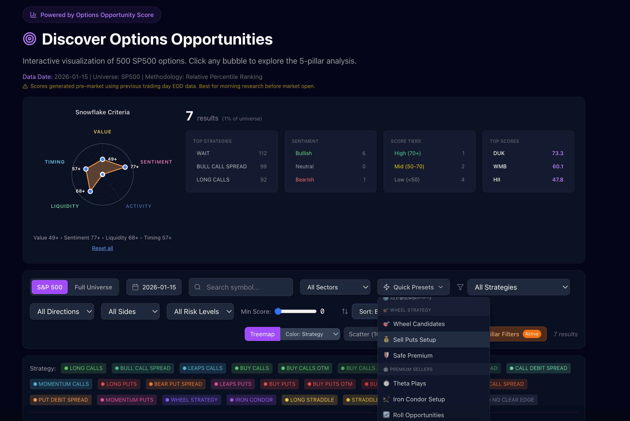 Browse the full universe of optionable stocks β not just the S&P 500. Use the interactive filter to find stocks that match YOUR criteria. Filter by bullish/bearish outlook, minimum scores, sectors, and strategies. We're also building Quick Presets for different goals β income generation (Wheel Strategy), selling premium (Cash-Secured Puts), time decay plays (Theta Strategies), and more. Whether you're a beginner or experienced, the 5-pillar scoring helps you navigate options information in plain English.
